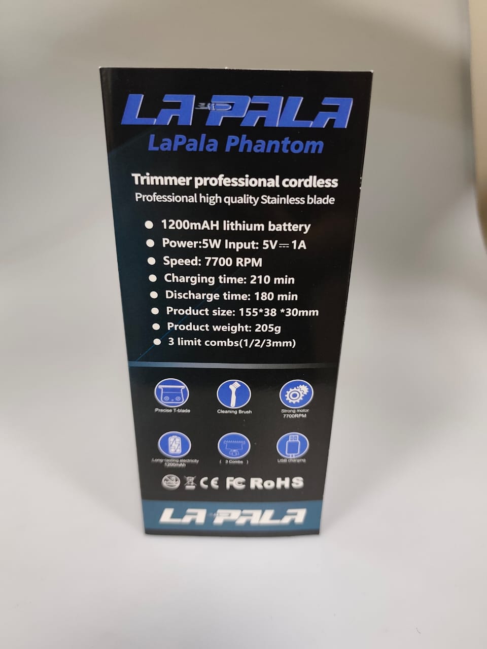 DLC —Moving blade:Ceramic—Motor: 280motor 7700rpm—Battery: Lithium 18500 1200mAh. —Charging time:3.5 Hours—Discharge time: 180 min